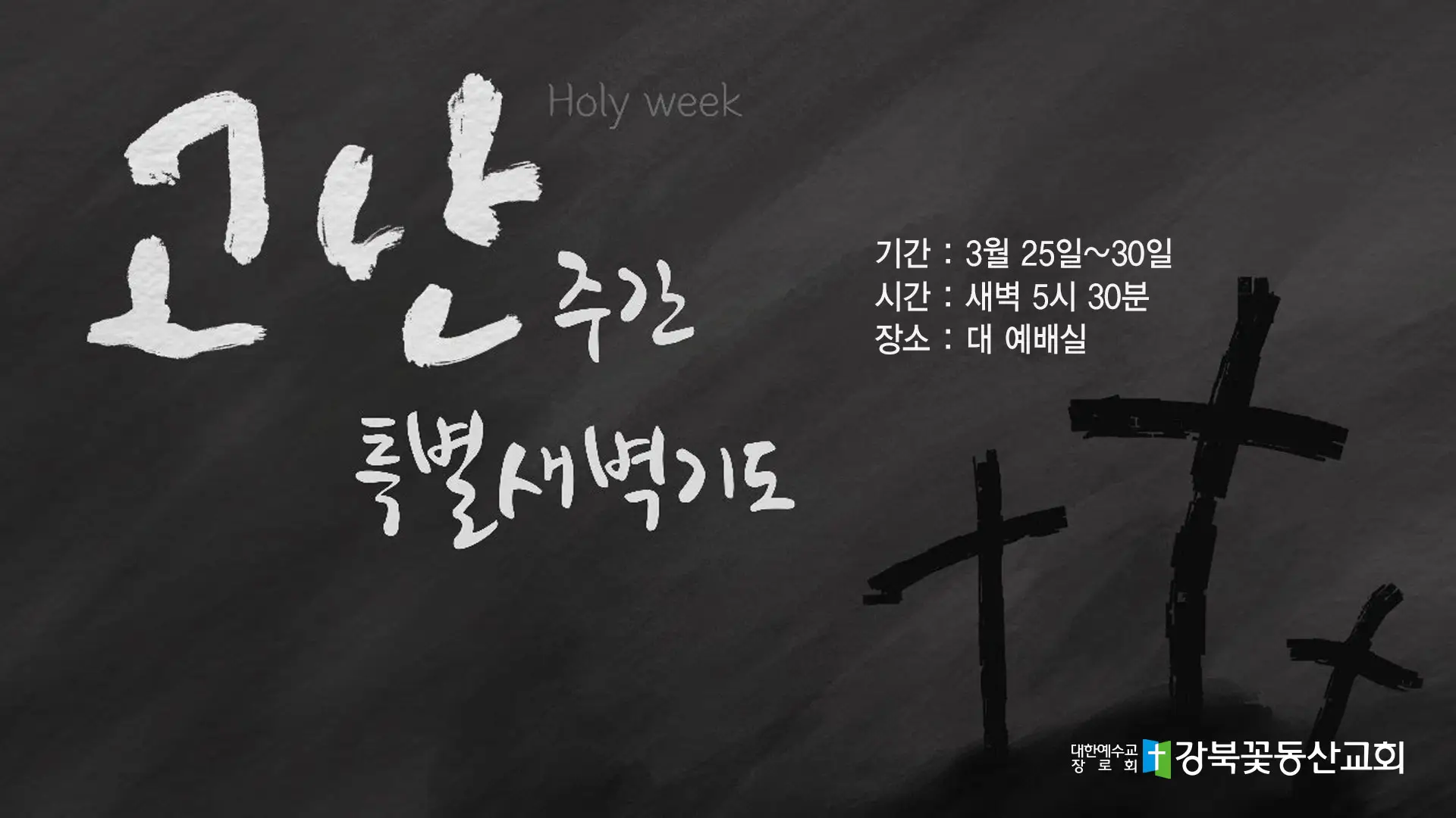 이번 새벽예배는 3월 25일부터 30일까지 본 교회에서 매일 새벽 5시 30분에 드려지며, 주님의 당하신 고난의 의미를 깊이 묵상하는 기간이 될 것이다.